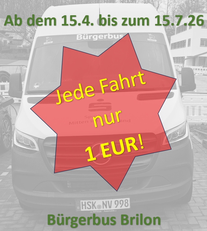 Der Bürgerbus Brilon e.V. möchte die Briloner in Zeiten hoher Treibstoffpreise mit preiswerter Mobilität unterstützen. Ab dem 15.4.26 kostet eine Einzelfahrt im Bürgerbus 3 Monate lang nur sagenhafte 1 EUR (Kinder 0,50 EUR). Alle anderen bekannten Tarife gelten weiterhin. Der Bürgerbus hält bei allen Einkaufsmöglichkeiten und Arztpraxen in Brilon. Er fährt Montag bis Samstag von 8:30 bis 12:30 und Dienstag und Donnerstag von 14:30 bis 18:00. Er kann über die Brimo-App oder telefonisch (02961/794 777, Mo. – Fr. 8 – 11 Uhr) gebucht werden.